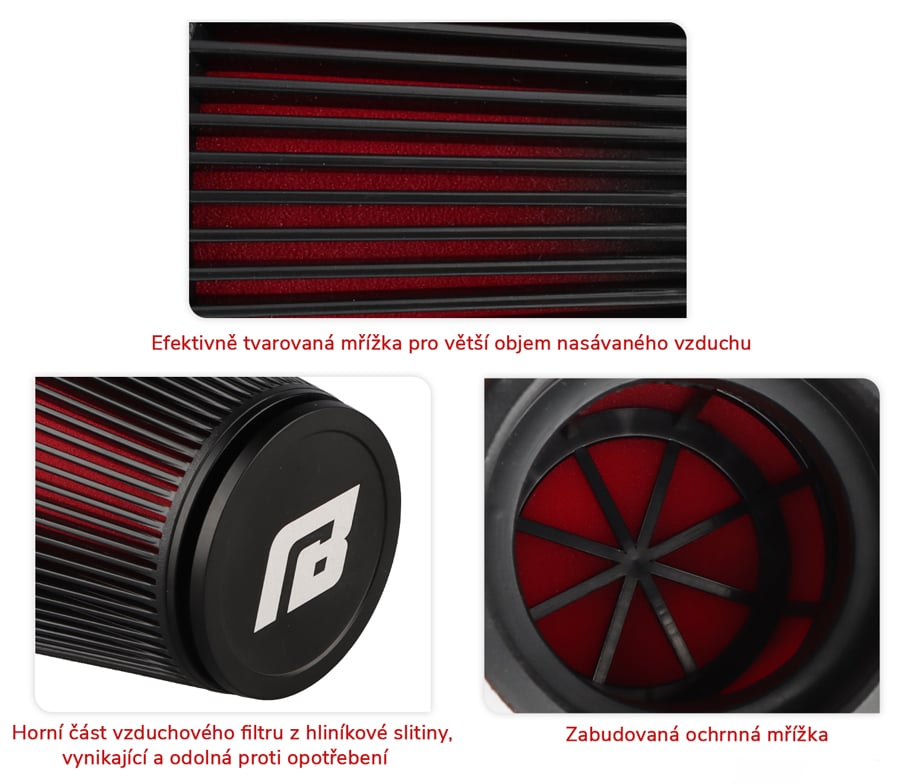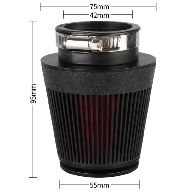 it is a high quality air filter. The upper part of the filter is aluminium alloy and ABS with wear-resistant coating to protect the filter from damage. The design of the filter body is designed for higher air intake, improving the gas response and increasing performance. The inner part of the filter is a foam sponge that makes even the finest impurities and dust. The filter is washable and usable again. This air filter has a 42mm mounting diameter, a total length of 95mm.
