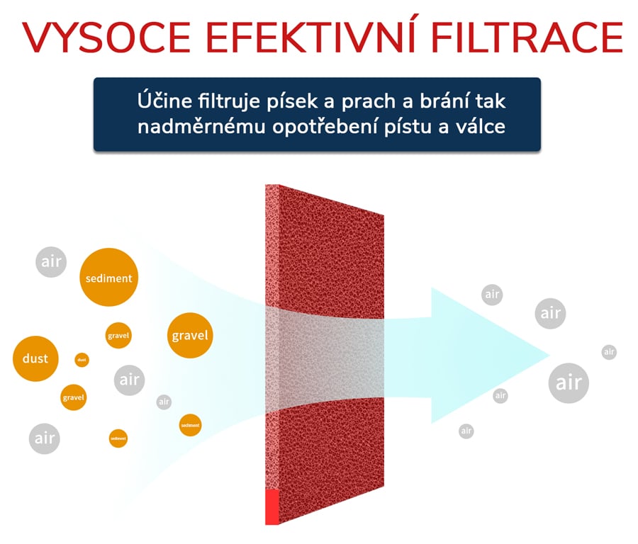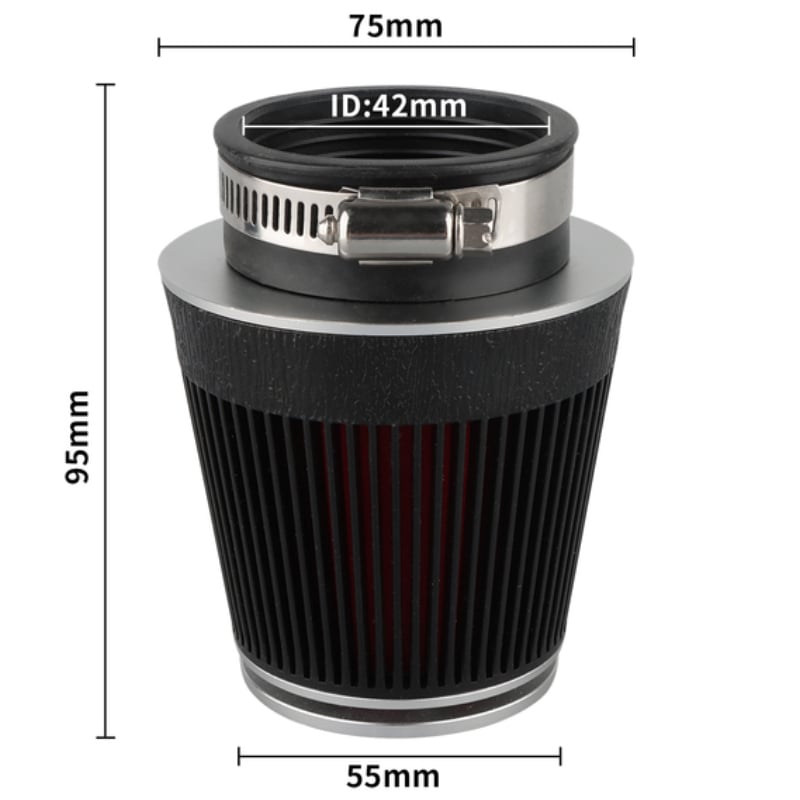 it is a high quality air filter. The upper part of the filter is aluminium alloy and ABS with wear-resistant coating to protect the filter from damage. The design of the filter body is designed for higher air intake, improving the gas response and increasing performance. The inner part of the filter is a foam sponge that makes even the finest impurities and dust. The filter is washable and usable again. This air filter has a 42mm mounting diameter, a total length of 95mm.