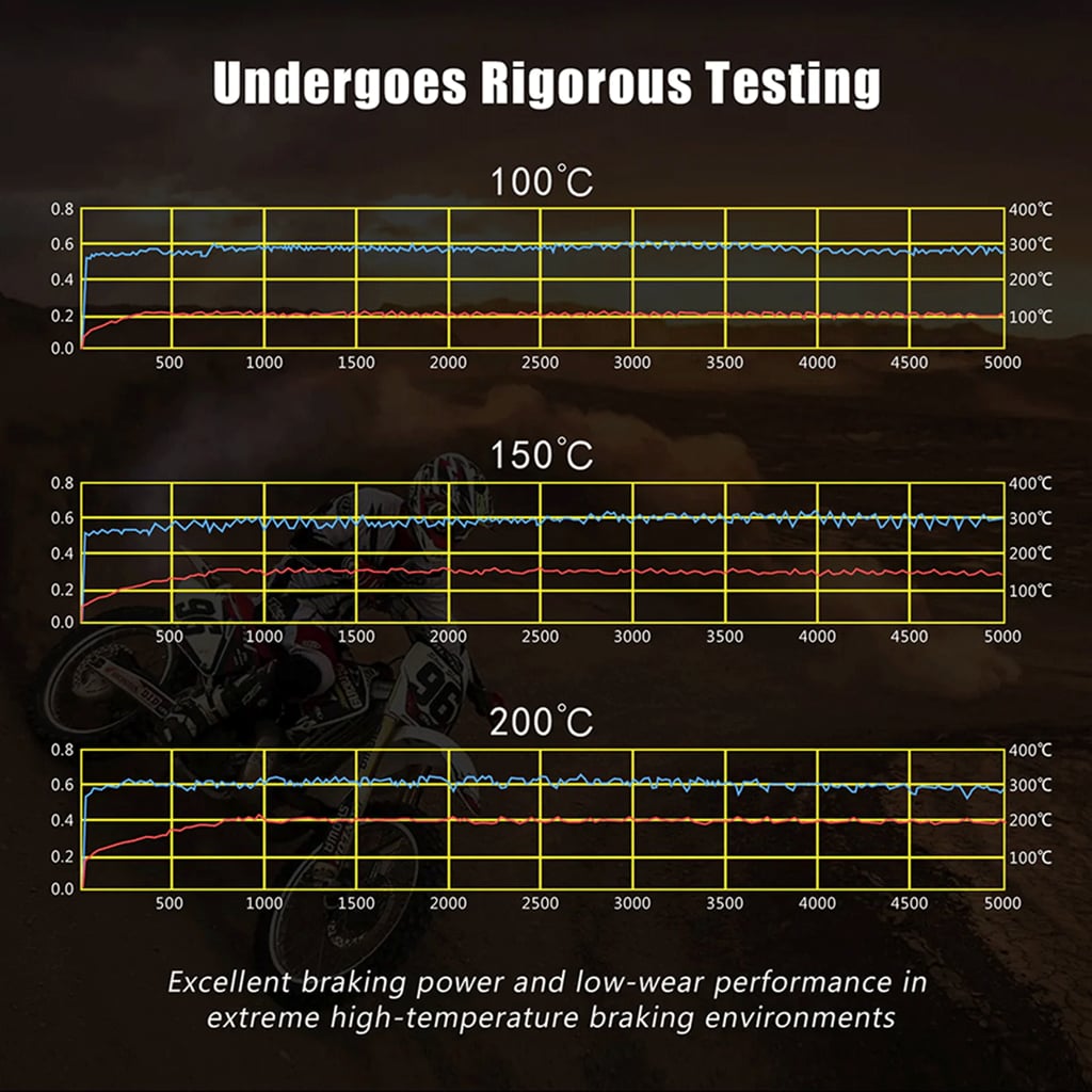 - Low temperature friction coefficient: 0,49µ-0,53Calculation (212 ° (F) - High temperature friction coefficient: 0,52µ-0,55Calculation (392 ° F-572 ° (F) - Sintered copper: Contains more than 50% copper powder, not containing ceramics or carbon fibres - High temperature resistance: 1112 ° F-1472 ° F - Low temperature resistance: Not less than 14 ° F - Initial braking force: 692N (212 ° (F) - Brake force at high temperatures: 736N (392 ° F-572 ° (F) - Disk wear: Low aggression - Silent. - Waterproof: Waterproof