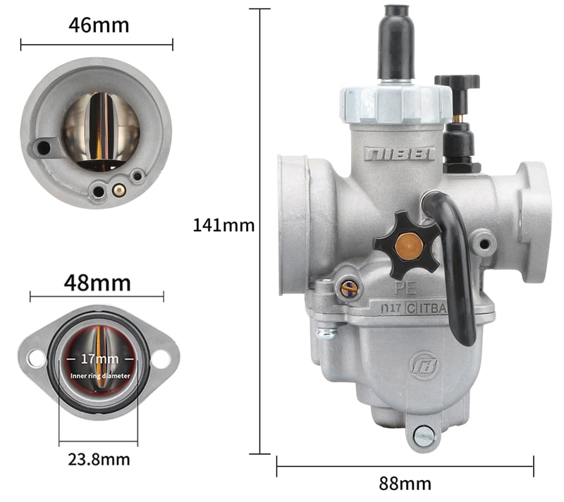 is most commonly used for 2T and 4T engines 100ccc-125cc quadricycles, motorcycles and go-kars. Thanks to excellent technology, the NIBBI RACING carburetors are perfectly tuned for better performance and lower fuel consumption. Aluminium alloy with anodic oxidation treatment which significantly improves corrosion resistance, wear resistance, insulation, thermal resistance and hardness of the carburetor.