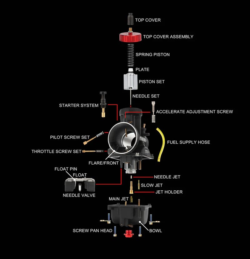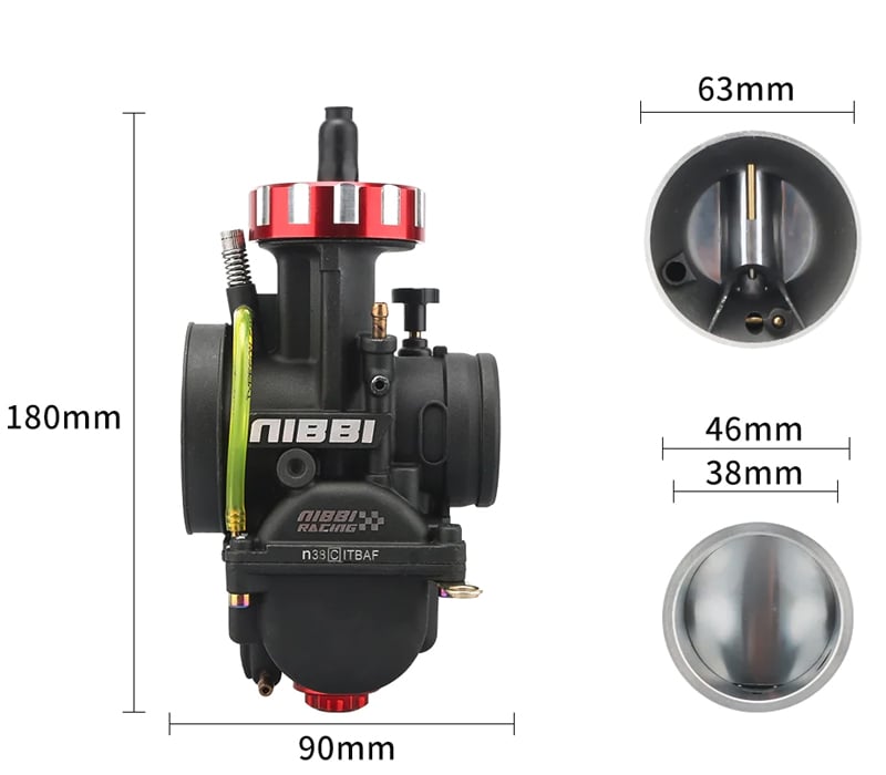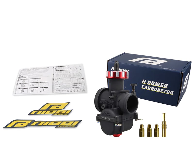 is most commonly used for 2T and 4T engines 450cc-500cc quadricycles, motorcycles and go-kars. Thanks to the excellent technology, the NIBBI RACING carburettors are perfectly tuned for better performance (5-10% more than normal carburettor) and have faster gas response. Nibbi Racing PWK carburetors are the perfect solution to improve vehicle performance. Aluminium alloy with anodic oxidation treatment which significantly improves corrosion resistance, wear resistance, insulation, thermal resistance and hardness of the carburetor. To achieve the best results, we also recommend buying the NIBBI RACING air filter. Accessible idle and mixture settings. The carburetor requires a rubber flange. The package includes a set of jets